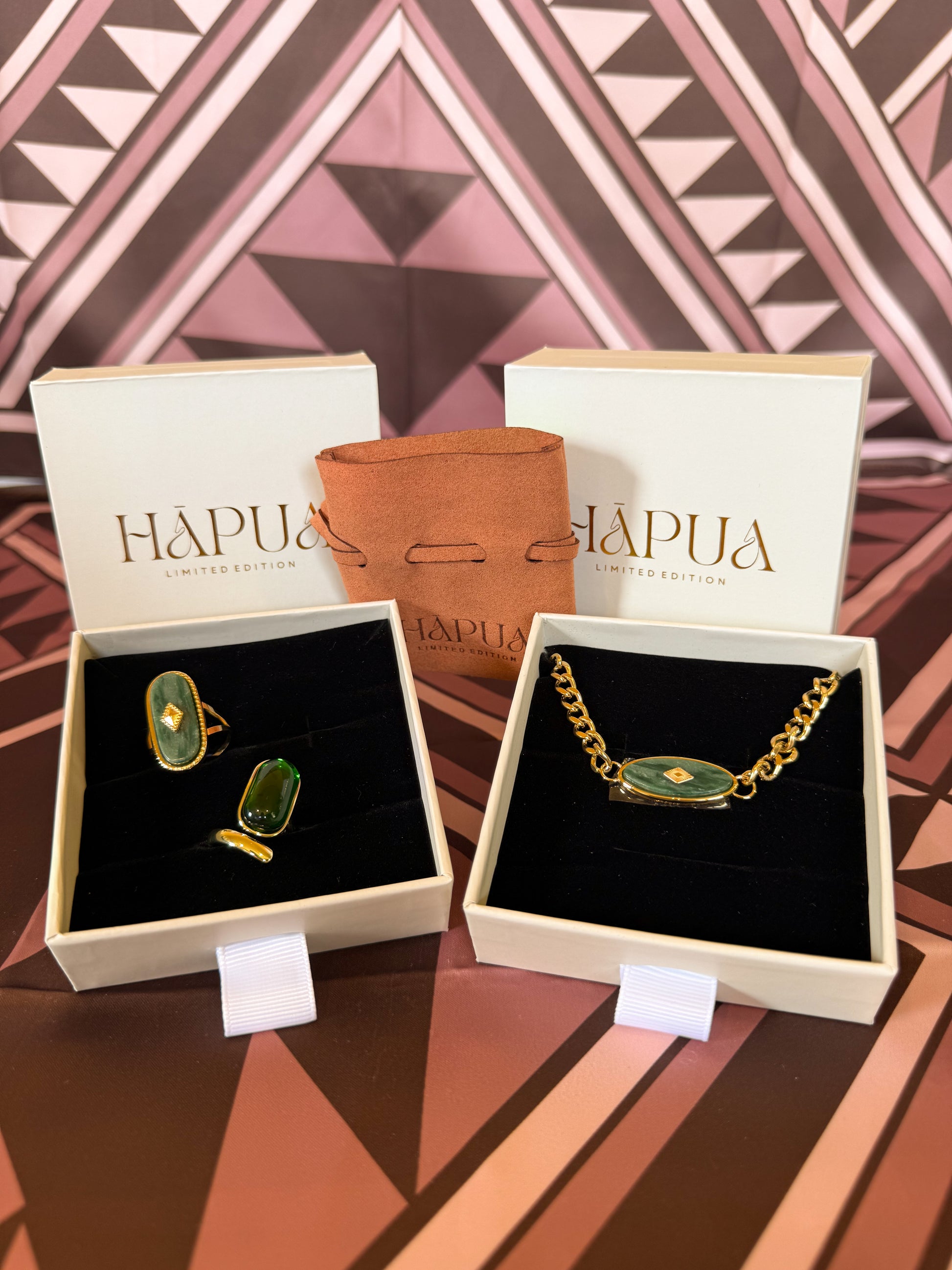 3 timeless pieces, showcasing our beautiful ao Māori. Our 18k plated Taimana Rīngi featuring our stunning Taniko design, with an andjustable band. Our elegant Patiki Kōmere in all its glory and our Greenstone Gold Plated Copper Rīngi also features an adjustable band.